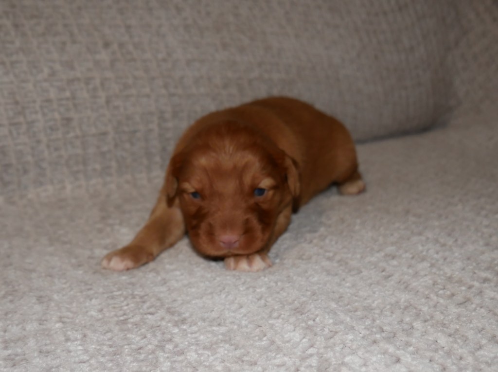 All of our available puppies on this page are up to date on their age appropriate vaccinations. They have all been started on crate training and are all near perfect with potty training in our house with our routine! All of the puppies are well socialized to young kids, as well as cats! These puppie have had 24/7 care from me and my wife since they were born! They are raised 100% in our home, with daily interactions with children and our family!